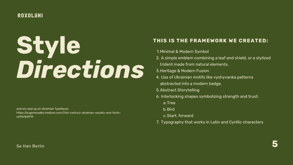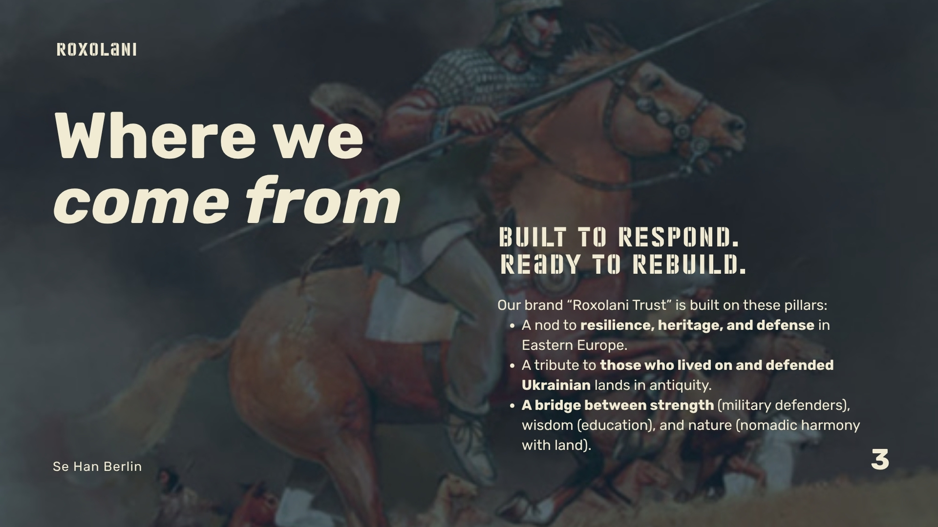 We are building a brand that goes beyond a aid — one that signals long-term commitment, strategic thinking, and stability. Roxolani is not only a force for immediate defense and reinforcement, but a lasting bridge to the West: a partner in rebuilding Ukraine and standing by its side until full recovery is possible.
